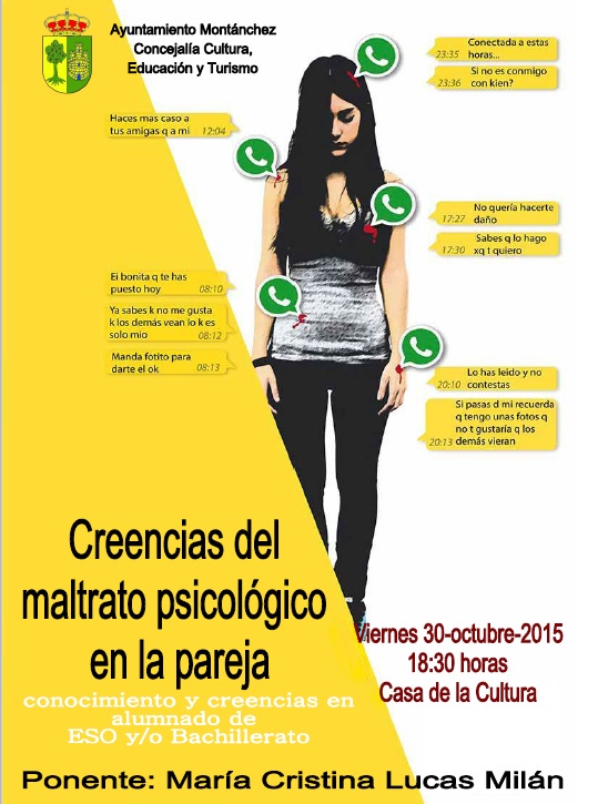 Viernes 30 de noviembre a las 18:30 horas en la Casa de la Cultura. Exposición del trabajo"Creencias del maltrato psicológico en la pareja". Especialmente orientado para el alumnado de E.S.O y bachillerato.